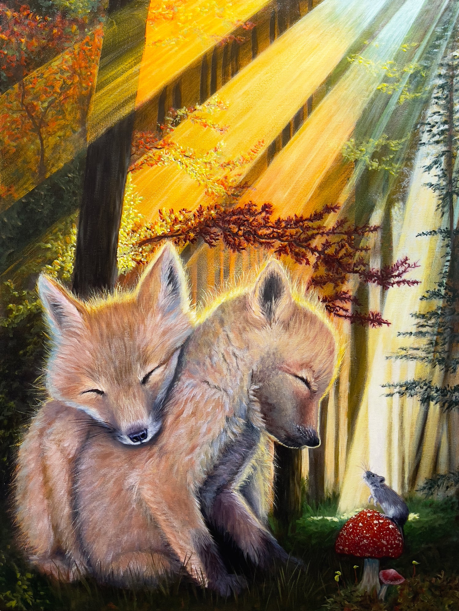 Impactful glowing light is a common theme in my process, be it the shining stars or the sun dancing on the silhouette of the figures I paint. Light is fascinating, as it is ever changing and influences the interpretation and mood of figures. My ambition to master depth and details comes with passion for rich color and texture as I lay down each layer of paint. With the subjects often being animals, my work forms deep emotional connections to viewers primarily through eyes and expressions.
